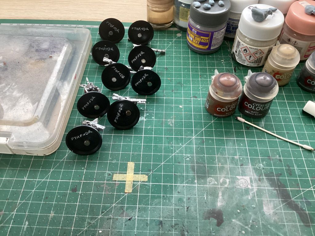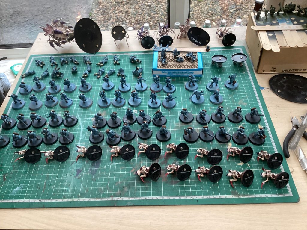 Magnetised some T’au and some Tyranids, then continued base-coating the Krieg webbing & back packs: they’re still at the ‘ugly stage’ but I’m hoping the rest of the base coats will go faster